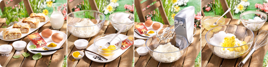 - Den Vanilleschaum mit je 1 Stück Apfelstrudel auf 4 Teller verteilen. Den Strudel mit Puderzucker bestreuen und mit einem Minzblatt dekorieren.